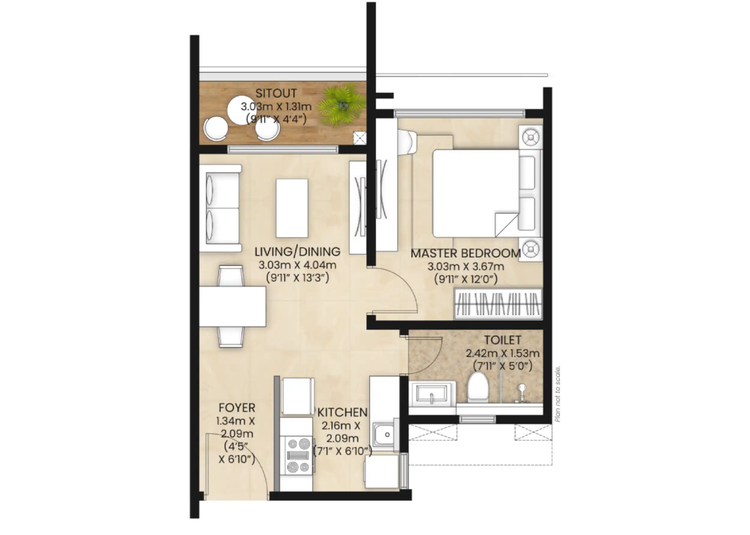 1 BHK Meadows carpet area is 37.16 sqm (400 sqft) excluding sit out, utility, and veranda area which is 3.92 sqm (43 sqft)